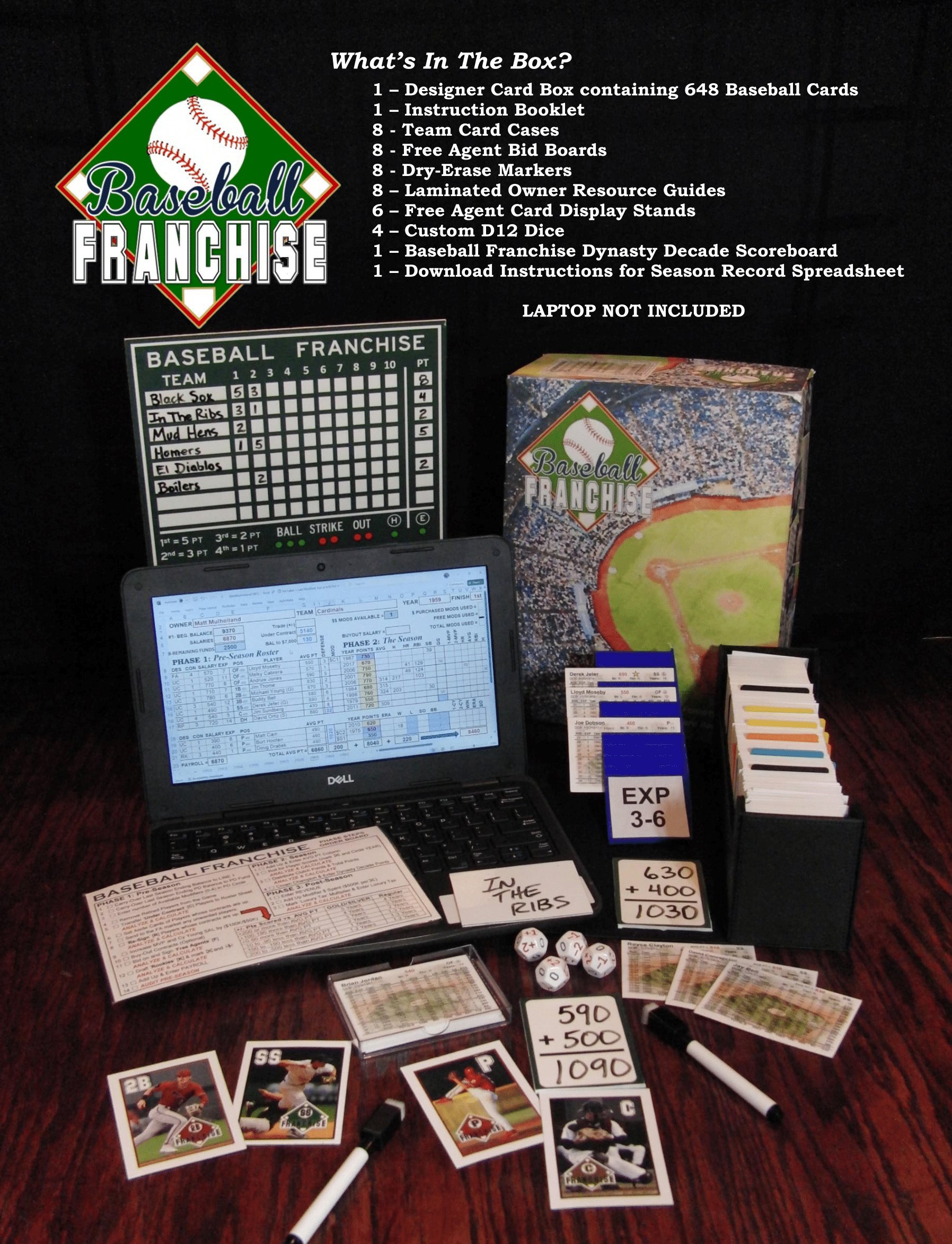 In BASEBALL FRANCHISE you take the role of owner of a big league ballclub. Draft, sign, and build your roster from a deck of over 600 statistically accurate big league player baseball cards. Compete each season against other teams using actual player stats to win the league championship. In the offseason replace retiring players, negotiate contracts, sign free agents, make trades, and draft rookies to build a Dynasty Baseball Franchise!